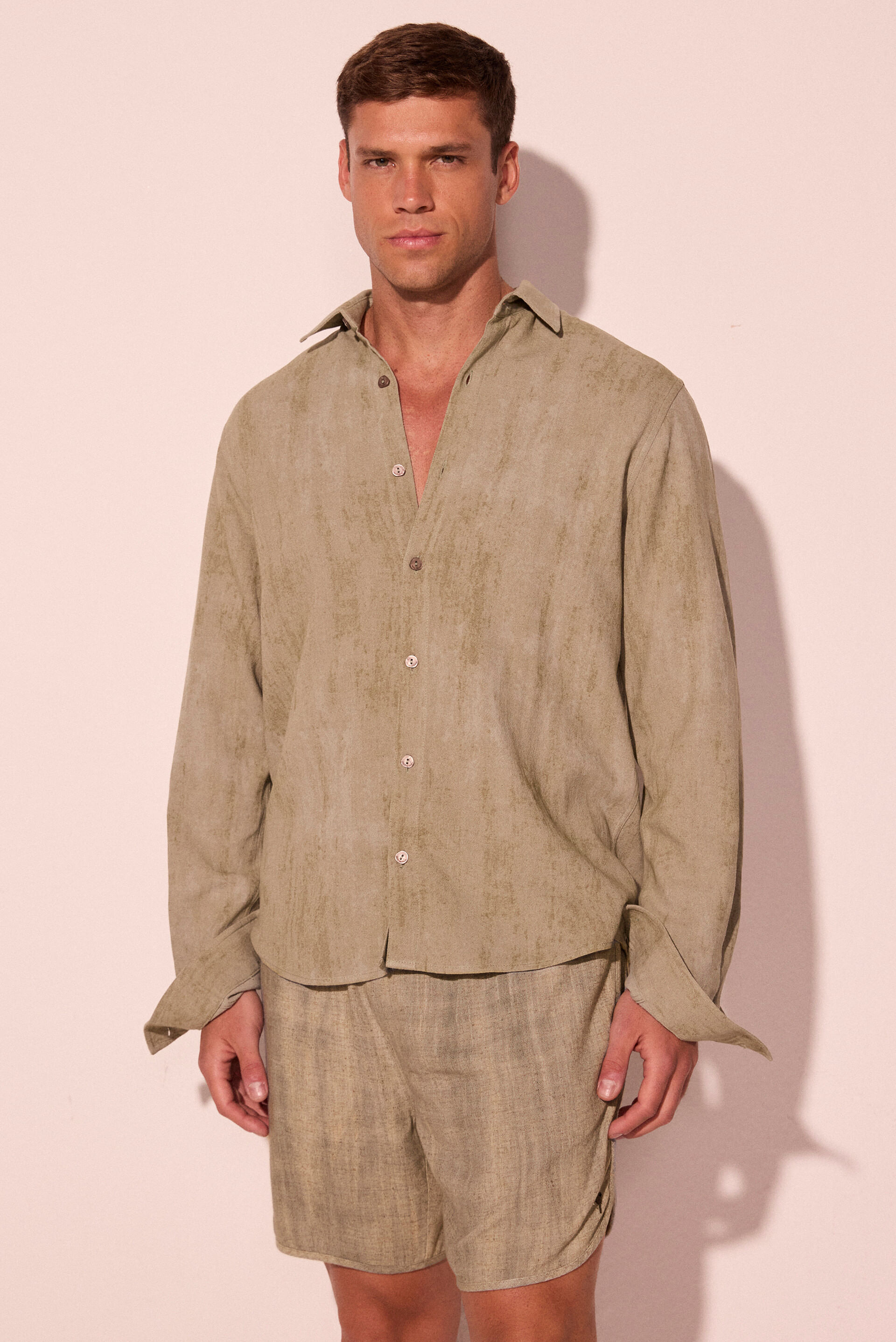 A Bermuda Casual Erva Doce, em viscose com linho, apresenta cós com elástico e ilhós, além de cadarço para amarração com ponteiras personalizadas, garantindo conforto e ajuste prático. O bolso traseiro verdugo e os detalhes de viés nas laterais e na barra acrescentam acabamento refinado, enquanto o coqueiro de metal assina a peça com identidade.
