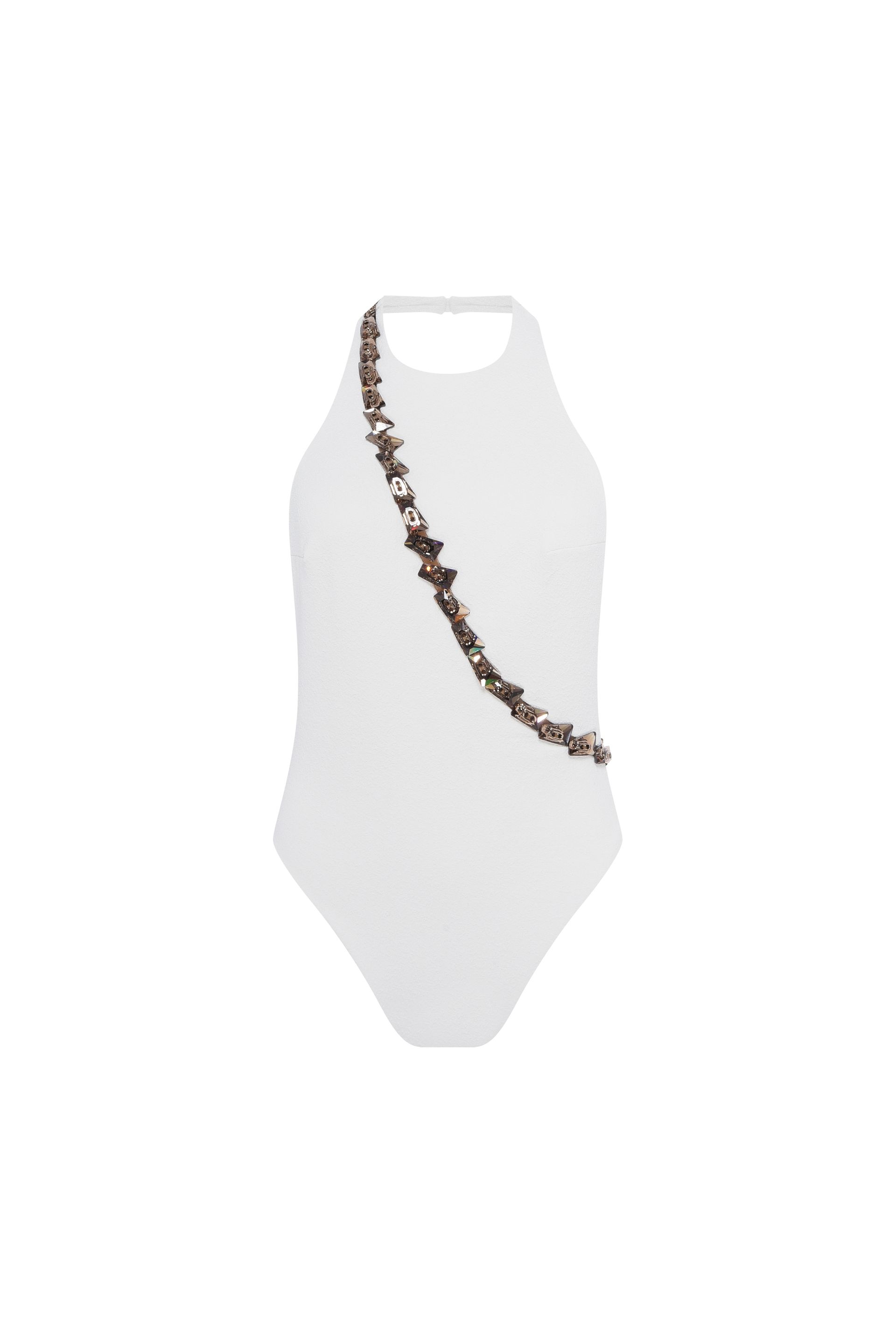 Sobre o Produto: O Body Frente Única Pedrarias Branco, confeccionado em ly textura bouclê, combina sensualidade e refinamento em uma modelagem sem bojo que se ajusta perfeitamente ao corpo. O bordado de pedrarias Swarovski em diagonal no corpo realça o brilho natural da peça, enquanto o fechamento nas costas com detalhe de pedraria acrescenta charme e acabamento premium. Uma criação elegante e luminosa, que reflete a essência sofisticada da ÁGUA DE COCO.