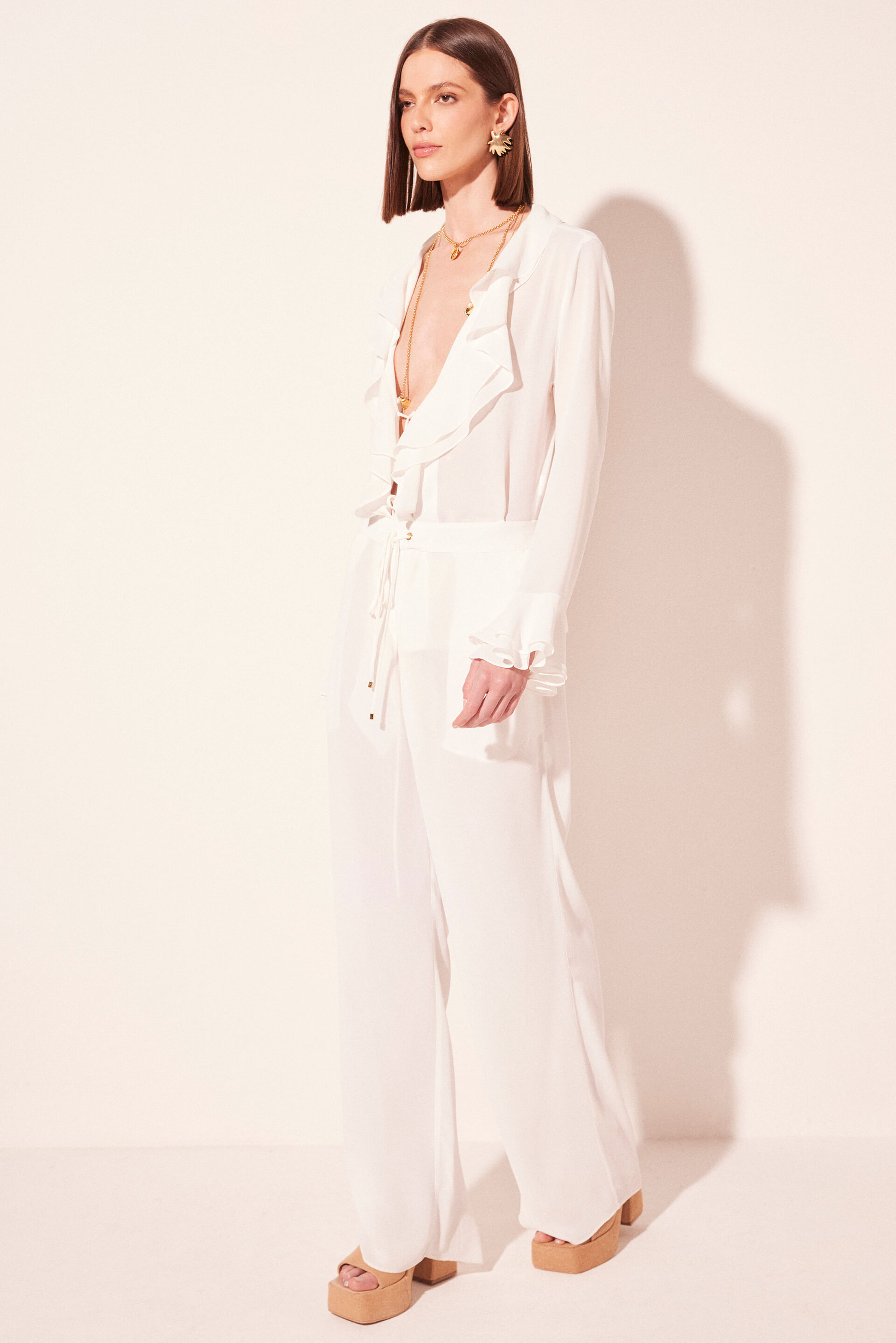 A Calça Reta Elixir, confeccionada em visco georgete, traz corte reto e cós com elástico e rolotê para ajuste confortável. A vista falsa e os bolsos laterais oferecem praticidade, enquanto as lapelas dos bolsos falsos nas costas finalizam o design com elegância e sutileza, traduzindo o equilíbrio entre leveza e sofisticação da marca.