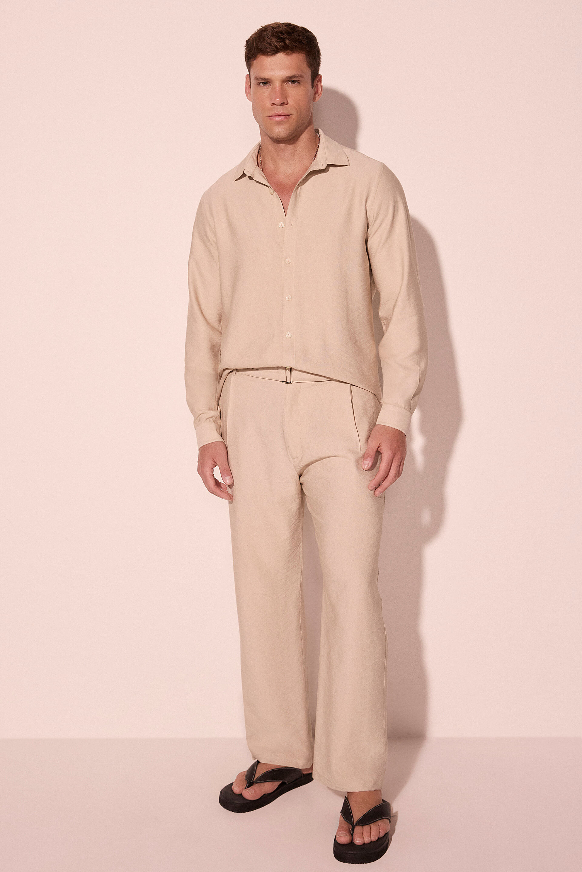 A Calça Reta Leveza Bege, em viscose com poliamida, apresenta modelagem reta com cós de alfaiataria e cinto que estrutura o visual com elegância contemporânea. As pregas frontais valorizam o caimento, enquanto os bolsos laterais e posteriores garantem funcionalidade. O coqueiro metalizado preto finaliza a peça com assinatura discreta.