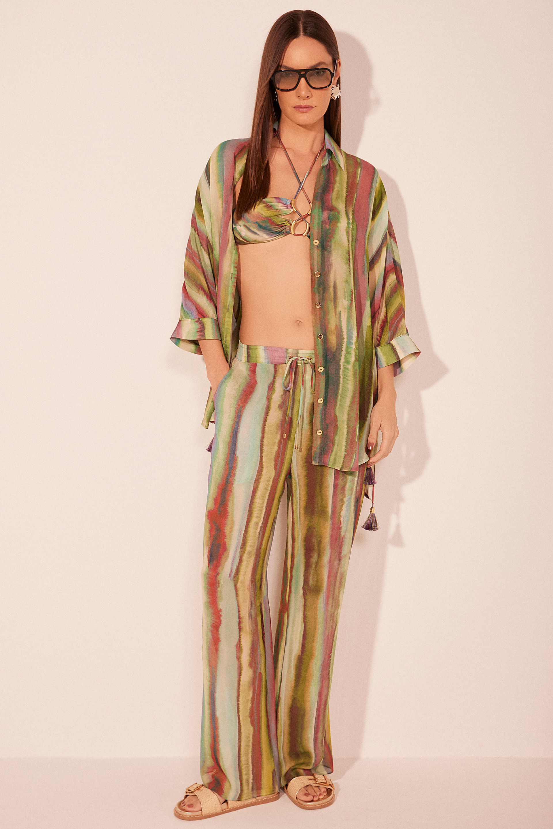 A Calça Reta Listrado Fluor, em georgette de viscose, possui corte reto e cós de elástico, proporcionando conforto e ajuste perfeito. O rolotê na cintura para ajuste e a vista falsa, juntamente com os bolsos laterais e a lapela de bolsos falsos nas costas, trazem um toque moderno e funcional à peça, tornando-a ideal para looks casuais e sofisticados.