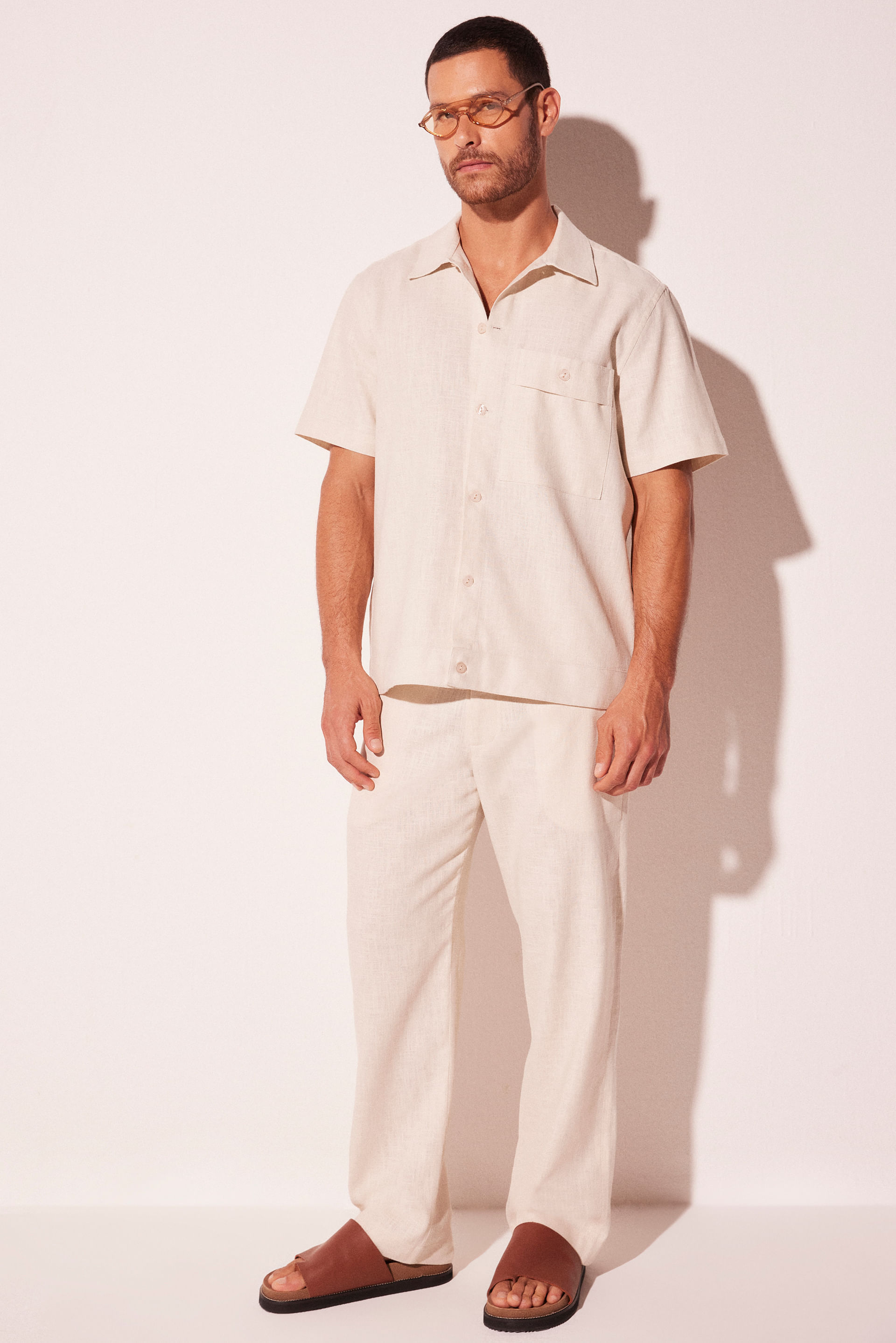 A Calça Reta Névoa, feita em rami misto, apresenta cós de alfaiataria com modelo de cinto, conferindo um visual mais estruturado. Os bolsos laterais e os bolsos posteriores com botão oferecem praticidade e estilo. A etiqueta de couro personalizada adiciona um toque sofisticado à peça.