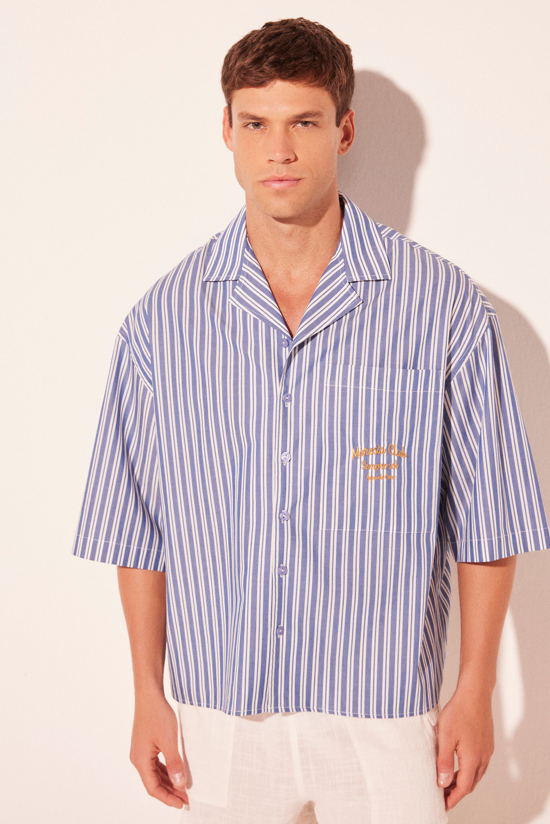 A Camisa Manga Curta Listrado, em listrado de algodão, apresenta gola sport e manga curta, combinando frescor e elegância casual. O bolso com bordado no peito adiciona um detalhe refinado e autêntico, enquanto a tapeta com botões de massa e a pala nas costas garantem conforto e bom caimento. A etiqueta de couro personalizada finaliza a peça com o toque único.