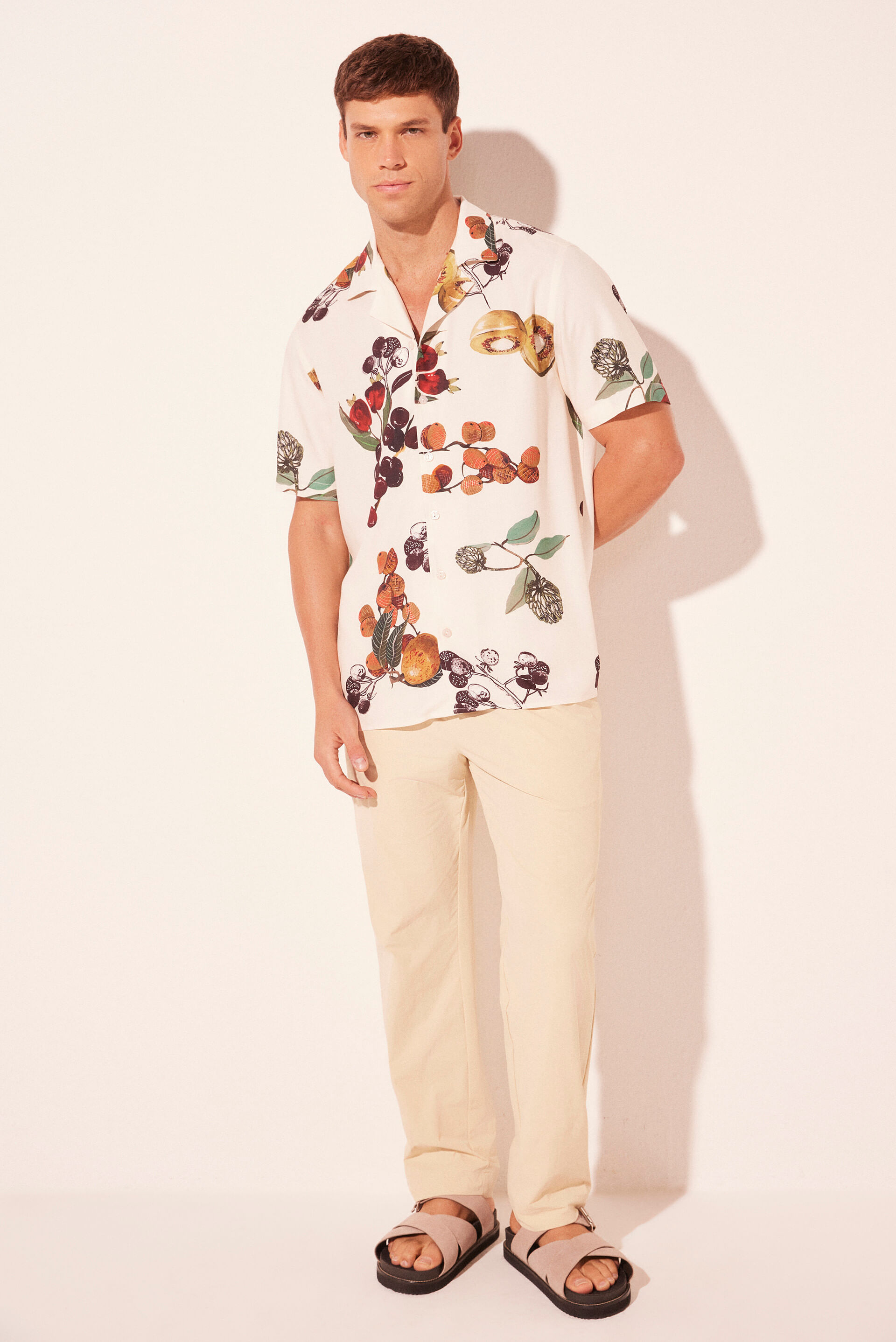 A Camisa Manga Curta Tropicália, confeccionada em viscose, apresenta gola sport e mangas curtas em uma modelagem leve e fluida. A tapeta com botões de massa e a pala nas costas asseguram conforto e caimento impecável, enquanto a etiqueta de couro personalizada reforça o acabamento refinado. A estampa de frutas tropicais sobre o fundo off ilumina a peça com energia e sofisticação, refletindo o lifestyle colorido e autêntico da ÁGUA DE COCO.