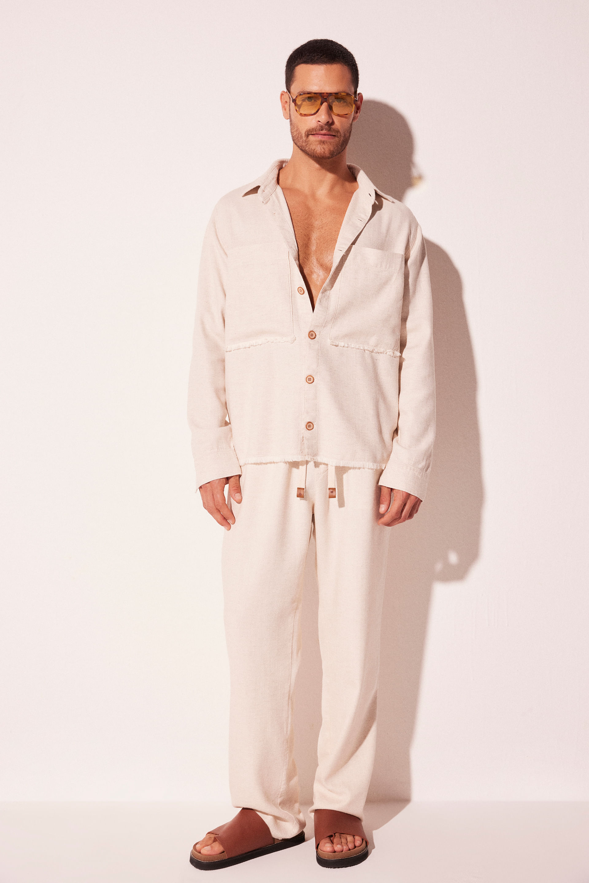 A Camisa Manga Longa Natural, feita em algodão com linho rústico, apresenta gola colarinho e tapeta com botões de massa, proporcionando um visual sofisticado e atemporal. Os bolsos frontais e a pala nas costas adicionam funcionalidade e elegância, enquanto a placa de couro personalizada e a barra desfiada garantem um toque moderno e exclusivo.
