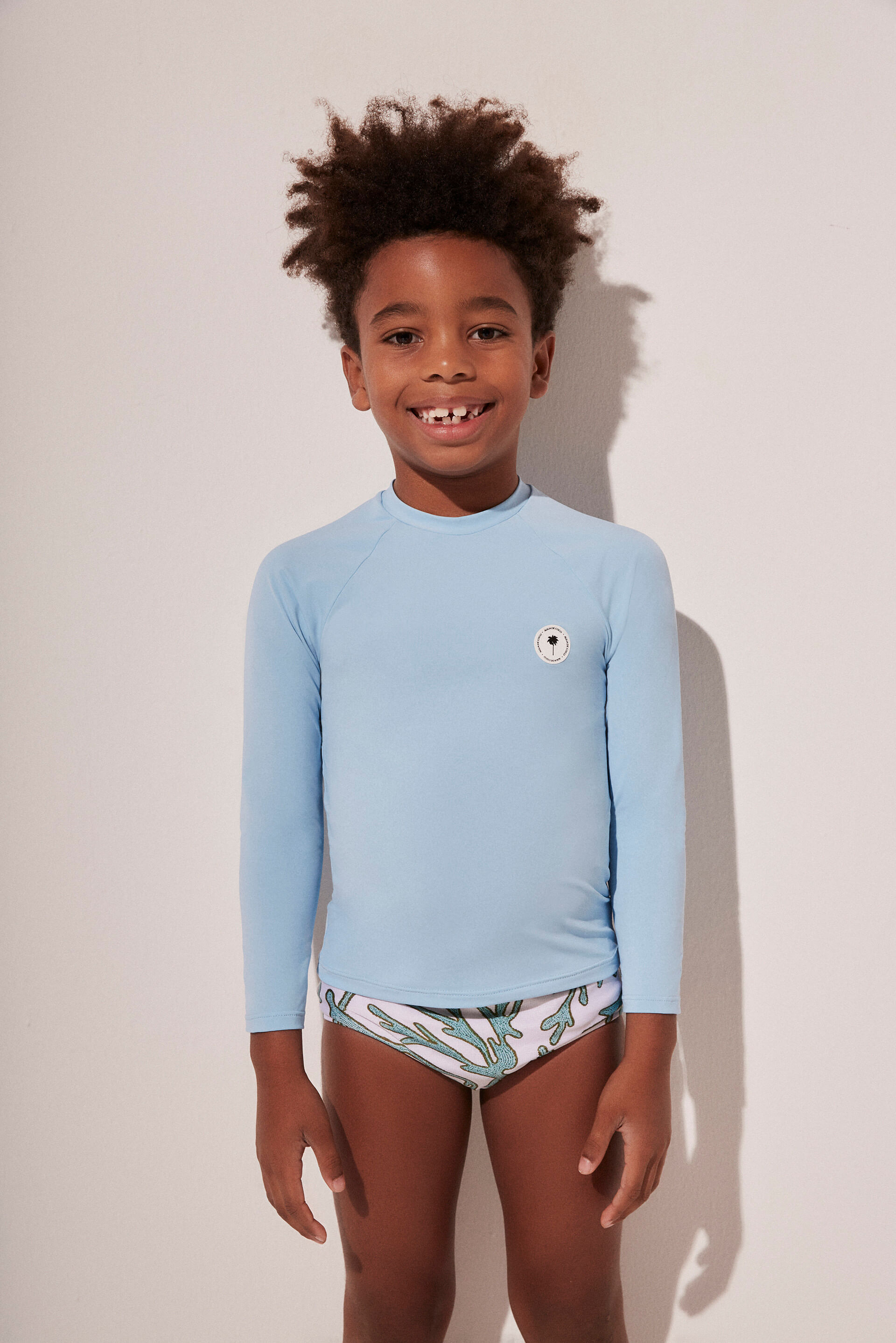 Disponível do tamanho 1 ao 11 e confeccionada em Lycra®, também possui a proteção UV50 que significa que o tecido bloqueia cerca de 98% dos raios solares, tornando-o uma escolha segura para as brincadeiras ao ar livre e exposição ao sol.