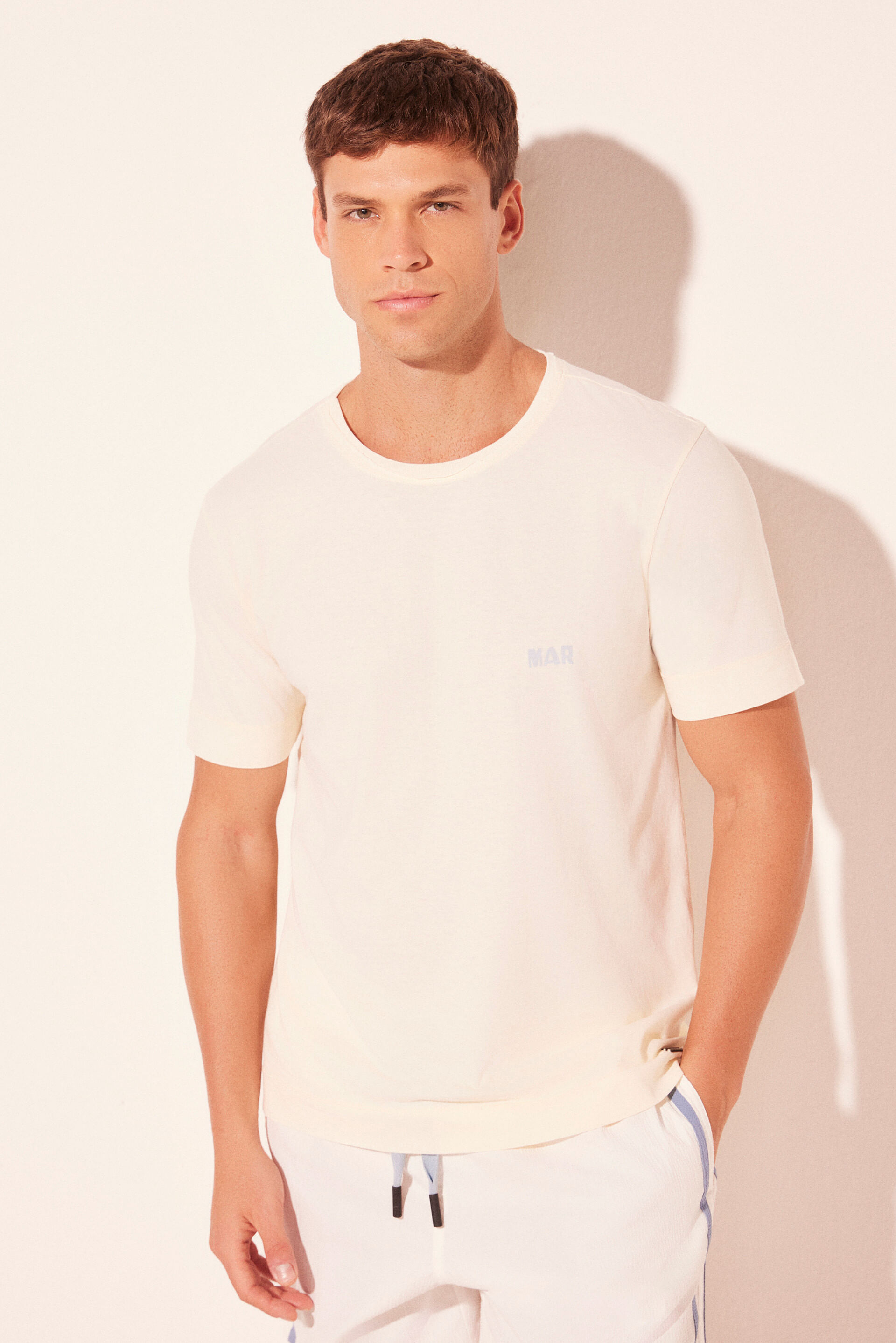 A Camiseta Manga Curta Silcada Marítimo Azul, em malha de algodão, apresenta modelagem clássica com gola careca e lavanderia marmorizada que confere textura e aspecto contemporâneo ao tecido. O silk de barco aplicado nas costas adiciona um toque náutico e sofisticado, enquanto a etiqueta de couro reforça o acabamento artesanal e autêntico da linha masculina da ÁGUA DE COCO.