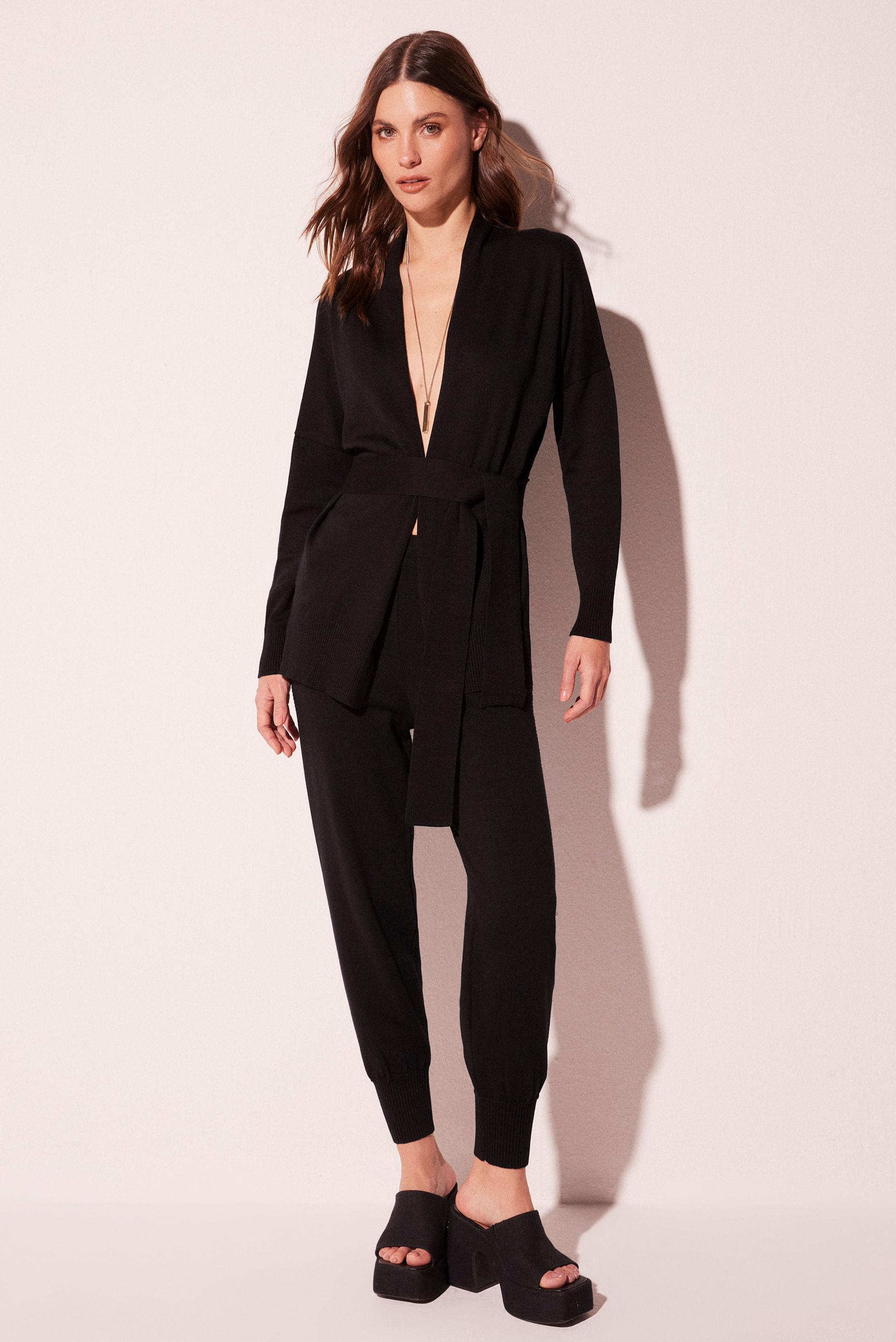 O Cardigan Regular Tempo Preto, feito em trico, apresenta modelagem regular e mangas longas, ideal para um look confortável e sofisticado. A fenda nas laterais da barra proporciona um toque moderno e descontraído, enquanto o passante nas costas com botão e a faixa que acompanha a peça garantem um ajuste perfeito e um toque de estilo adicional.
