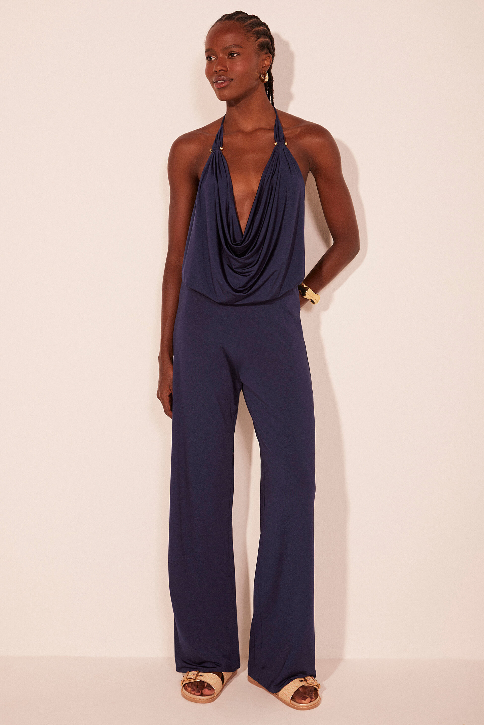 O Macacão Longo Solaris Azul tem blusa frente única com efeito degagê e amarração no pescoço. A modelagem de calça reta, elástico na cintura e decote profundo nas costas criam um visual elegante. Detalhes como o aviamento de piercing embutido no ombro tornam a peça única e sofisticada.