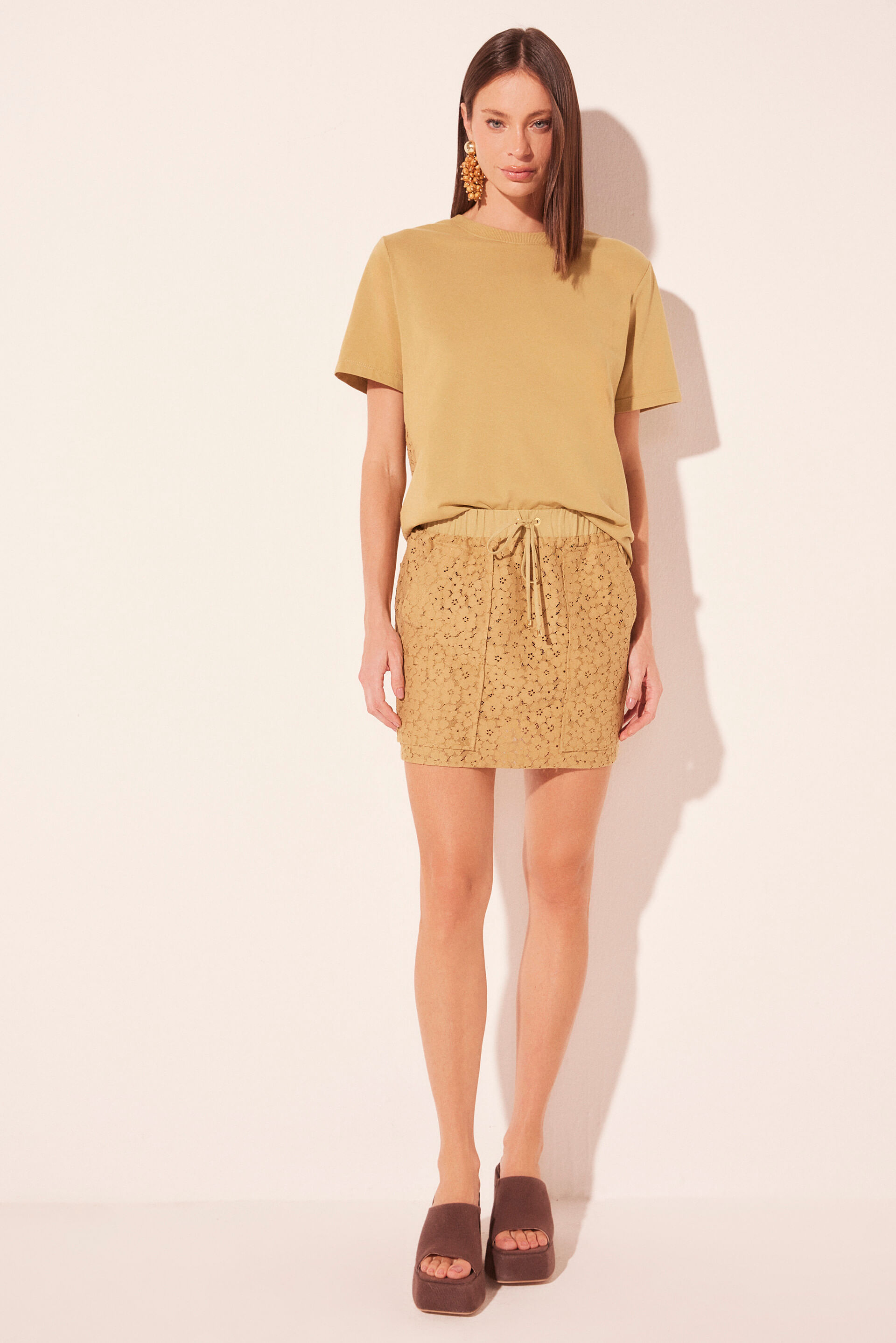 A Saia Curta Sopro Verde, feita em malha renda floral, possui cós de elástico com rolotê para ajuste e ponteira, garantindo conforto e ajuste perfeito. Ilhós, bolsos aplicados na frente e pences nas costas adicionam detalhes funcionais e estruturais. A renda floral verde dá textura e um toque sofisticado, tornando a peça leve e cheia de personalidade.