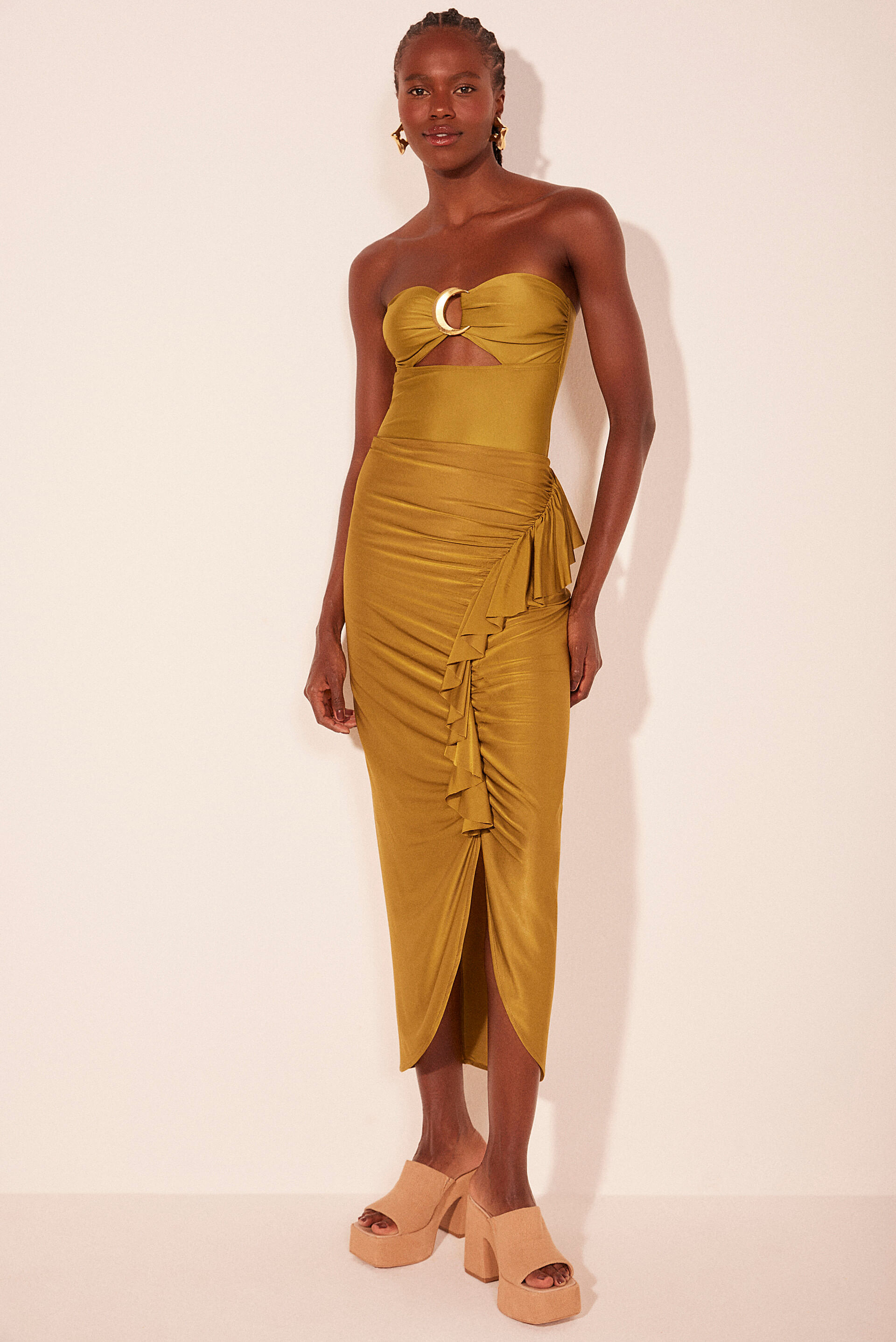 A Saia Midi Icapuí Verde, feita em visco jersey, apresenta modelagem ajustada ao corpo, criando uma silhueta elegante. O recorte transversal com babado em cascata franzido adiciona movimento e fluidez à peça, enquanto a fenda no centro da frente, também franzida, proporciona um toque sensual e sofisticado., confeccionado em VISCO JERSEY, apresenta lateral fixa e modelagem anatômica com bumbum partido. O detalhe de bordado na frente, imitando o padrão do animal oryx, adiciona sofisticação e um toque moderno à peça.