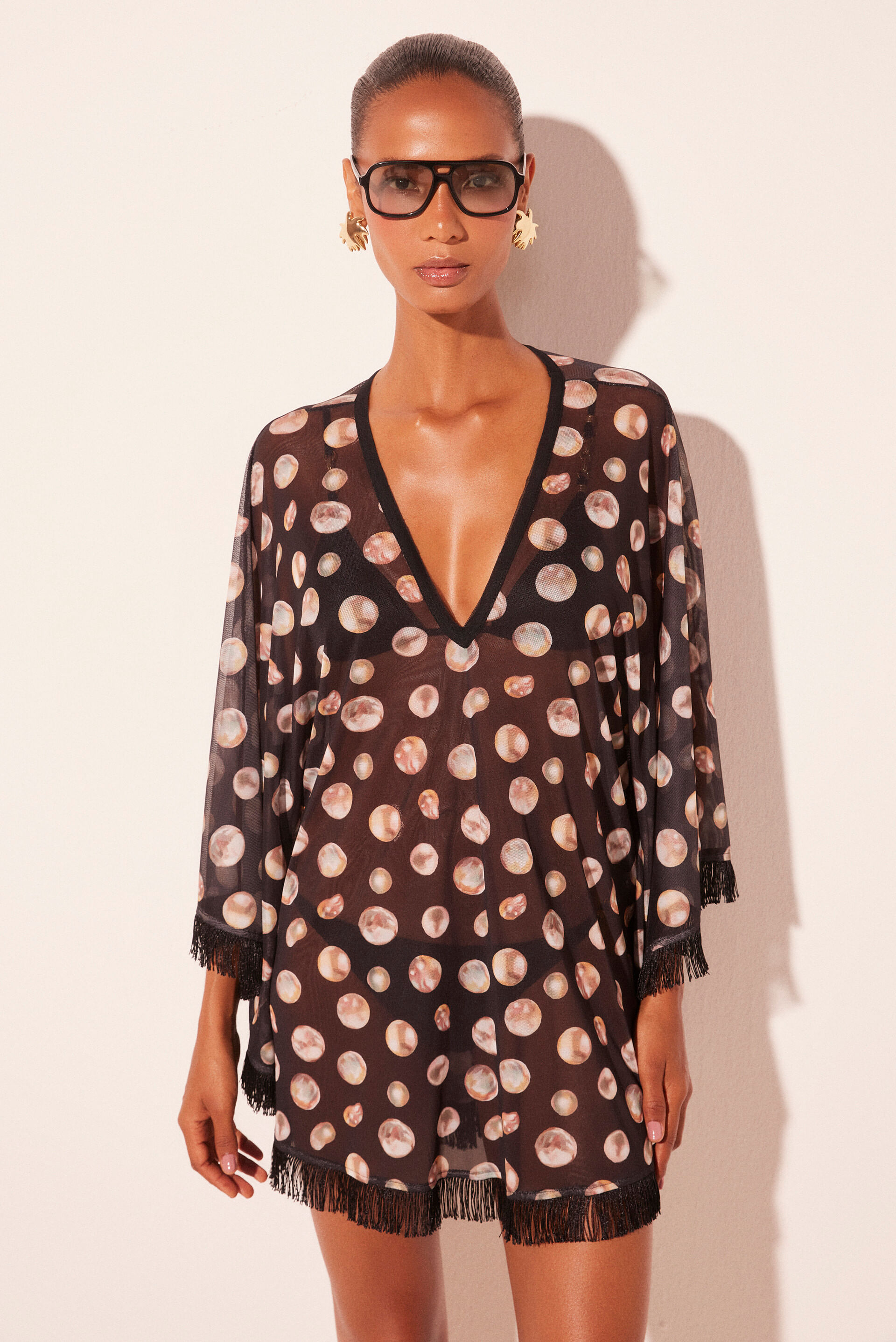 O Vestido Curto Franjas Pérolas, confeccionado em tule leve, exibe a estampa de pérolas sobre fundo preto. De comprimento curto e decote em V profundo na frente e nas costas, o destaque fica por conta das franjas aplicadas em toda a barra, que criam movimento fluido e visual sofisticado.