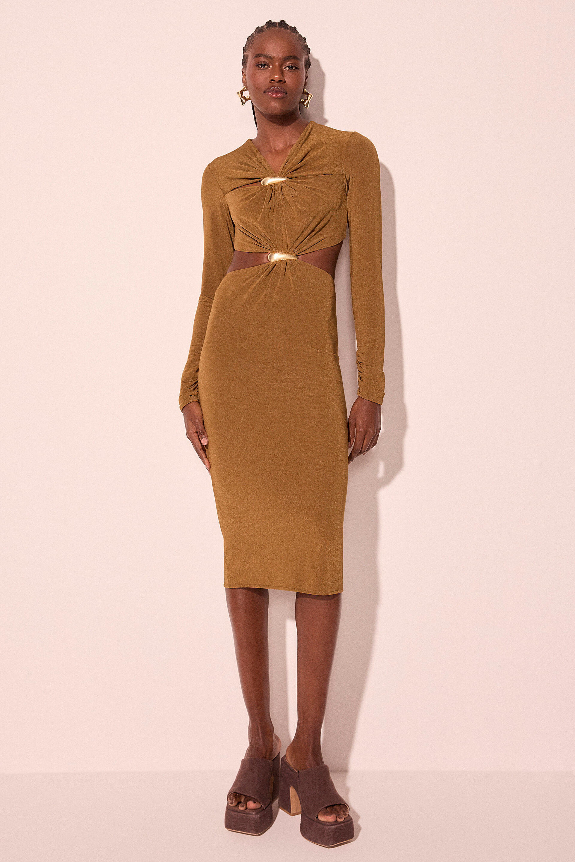 O Vestido Midi Gotas Dourado, confeccionado em malha tricô creponada, possui modelagem ajustada ao corpo que acompanha as curvas com elegância. O aviamento em gota aplicado na frente destaca o desenho da peça, enquanto o franzido no centro do bumbum valoriza a silhueta de forma sutil. O dourado luminoso do aviamento cria um efeito vibrante e sofisticado, evocando transformação e energia viva.
