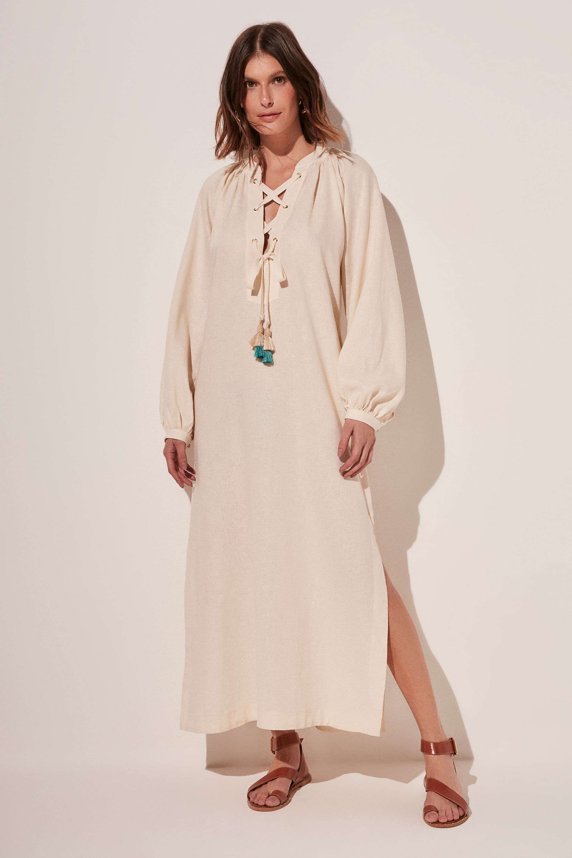 Com propostas pensadas para ir além da praia, o mix Litoral Leveza traz este vestido midi elegante e fluido.